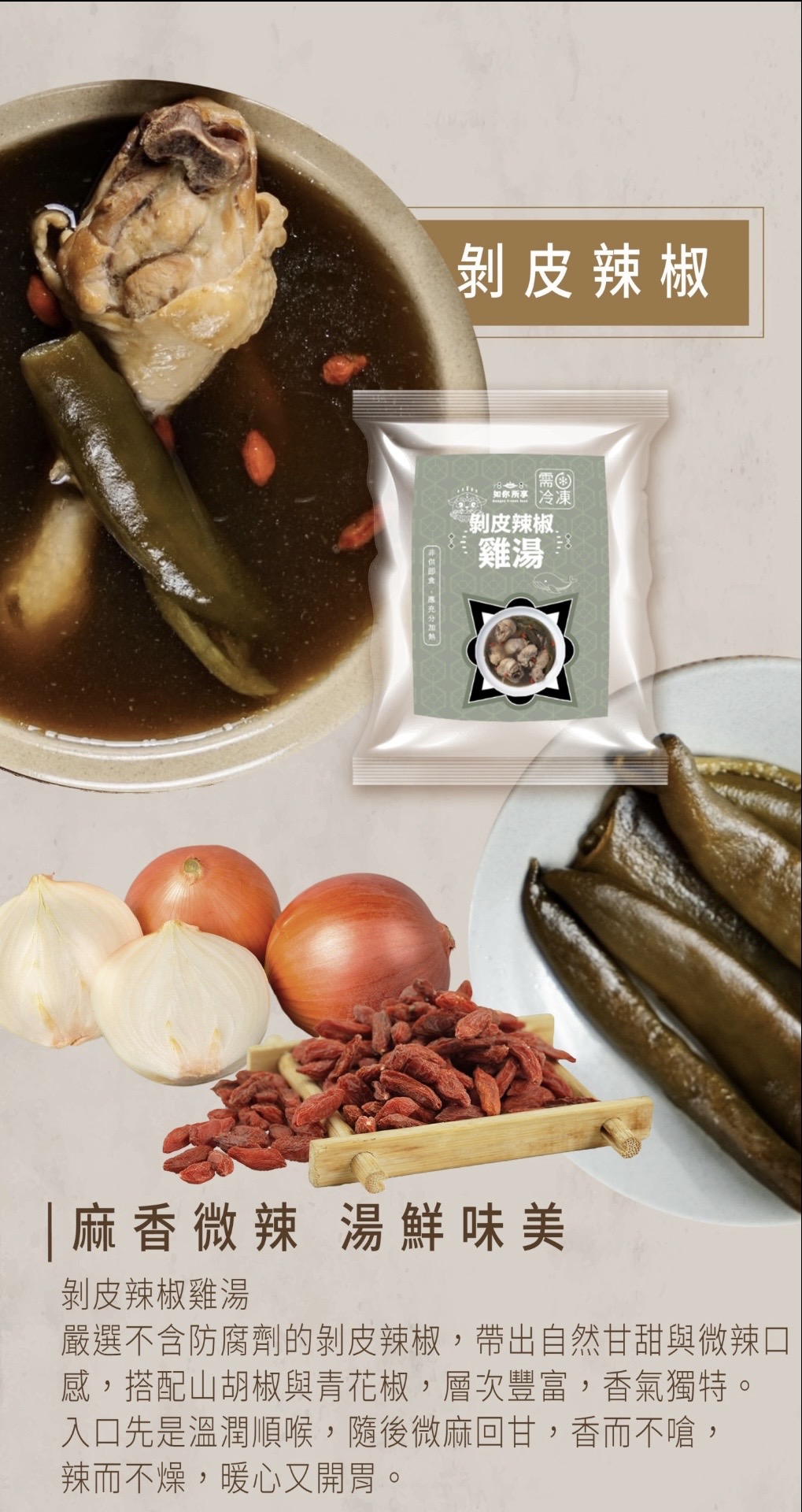 當香辣夠味的剝皮辣椒與鮮甜滋補的雞湯相遇,便成就了這道令人回味無窮的剝皮辣椒雞湯。而我選擇購買傳承50年經驗的品牌<如你所享>它不僅幫消費者省去繁瑣的料理工序,也將黃金湯頭比例的配方融入在這道美味的湯頭中,喝一口絲絲入魂,令人回味無窮,剝皮辣椒的微辣與鮮美的雞湯 兩種食材的風味,更將其湯頭的美味昇華到另一番境界營養價值完美結合,為人體帶來多重益處 <如你所享>的黃金比例剝皮辣椒雞湯,值得每一位消費者品嚐,在滿足口腹之慾之外更能體會到什麼是絲絲入魂扣人心懸的人間美味