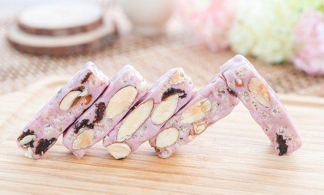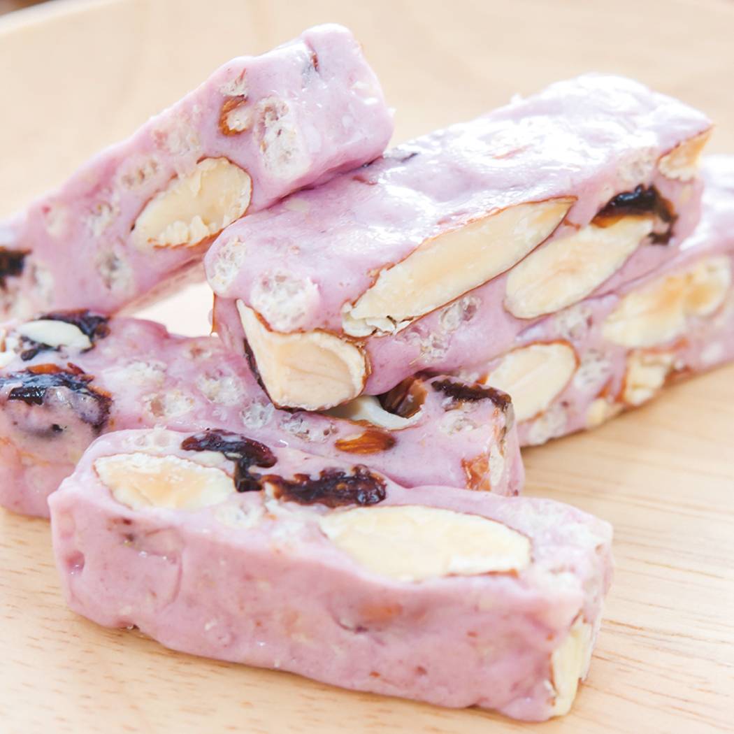 牛軋糖為手工製作,採用100%臺灣嘉南平原栽種的紫心地瓜;品種嚴選來自日本鹿兒島紫地瓜,成分純正,營養價值高;搭配低溫烘焙杏仁果~口感軟硬適中,條條飄著紫地瓜奶香。